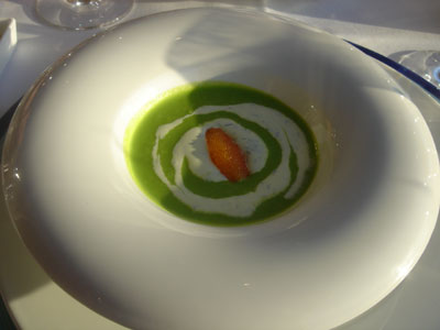 青豆、魚子、忌廉,三色濃稠如畫板上的顏料。膩滑的冷湯裡頭,只有極濃的豆香,但不見豆蹤,相信要先把豆衣去掉再細磨成末,不然不成。