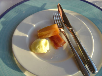 間場的一小球雪芭,清一清味蕾,但奇怪如牛油濃香,很奶。兩小段大黃(rhubarb)的葉柄,煮得爛熟但還帶有纖維的柔韌。