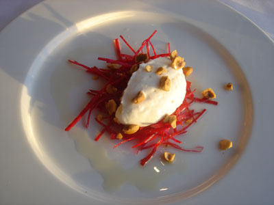 繼續避重就輕,連羊奶芝士也弄成糊狀,不膩。以切成細絲的甜菜頭作底。不過我還是喜歡果仁多一點。