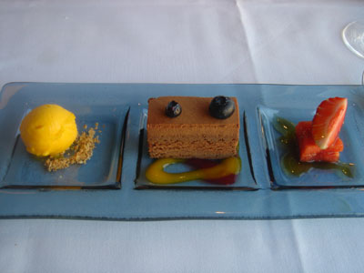 相比下作結的甜品便少了驚喜。不過芒果雪芭真材實料,香滑。西瓜沾上了焦糖,爽甜。而朱古力蛋糕有三層不同的質感,軟綿。