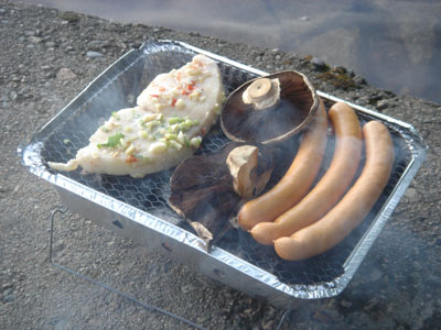 差不多晚上八時才出發,抵達湖邊的時候斜陽已開始貼近對岸山上的林邊。找過平地坐下,有點冷,小滿生火,爪爪取出麵包、香腸、蘑菇、茄子,還有我提議的Escolar