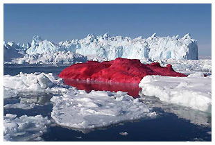 曾以攪拌機活活攪碎金魚的丹麥藝術家埃瓦里斯特(MarcoEvaristti),周三再展出具爭議藝術品。他把一座位於格陵蘭西面(丹麥領土,位於加拿大東北面)、面積九百平方米的冰山染成血紅色,說是為大自然裝飾。四十歲的埃瓦里斯特表示:「所有人都需要裝飾大自然,因為這是屬於大家的。這是我的冰山,是屬於我的。」